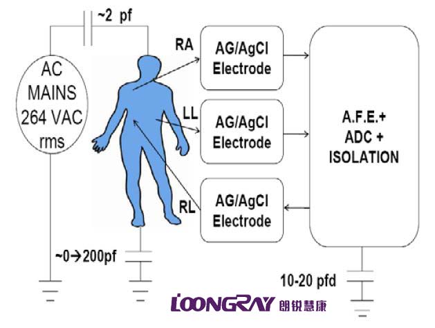 人類心臟對50 Hz至60 Hz的電流最為敏感。已經(jīng)證明,只要34 μA rms的50 Hz/60 Hz電流流經(jīng)心臟,心臟就會受損,引發(fā)危害生命的事件。考慮到ECG系統(tǒng)與病人相連時可能執(zhí)行的各種程序,包括針對起搏器/自動植入式心臟復(fù)律除顫器(AICD)的留置導(dǎo)尿等,目前的50 Hz/60 Hz電流限制設(shè)定為10 μA rms。在ECG設(shè)計(jì)中,無故障條件下的10 μA rms限值就是設(shè)計(jì)參數(shù)。美國心臟病學(xué)會(ACC)同時建議將10 μArms的限制擴(kuò)展到單一故障條件下。